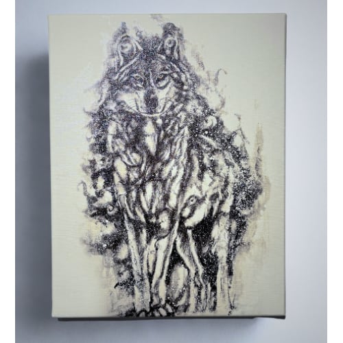 〜インテリア水墨画〜 水墨画で描くオオカミ② オオカミの繊細な毛並みを丁寧に表現をして 魅せる動物画の原点となる作品。 キャンパスアートで取り扱いやすくしました。 おしゃれなインテリアとなります。 ニス加工済みの上質な仕上がりです。 サイズ 約41cm×32cm×2cm